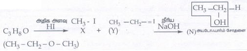 19. C3 H8O என்ற மூலக்கூறு வாய்பாடுடைய ஒரு மோல் சேர்மமானது, இரு மோல்கள் HI உடன் முழுவதுமாக வினைபுரிந்து X மற்றும் Y ஐத் தருகிறது. Y ஐ நீர்த்த காரத்துடன் கொதிக்க வைக்கும் போது Z உருவாகிறது. Z ஆனது அயடோபார்ம் வினைக்கு உட்படுகிறது எனில் A என்ற சேர்மம் யாது?
