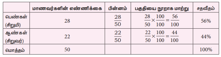 50 மாணவர்களைக் கொண்ட ஒரு வகுப்பில் 28 மாணவிகளும் 22 மாணவர்களும் இருக்கிறார்கள் எனில், அவர்களின் சதவீதங்களைக் காண்க.
