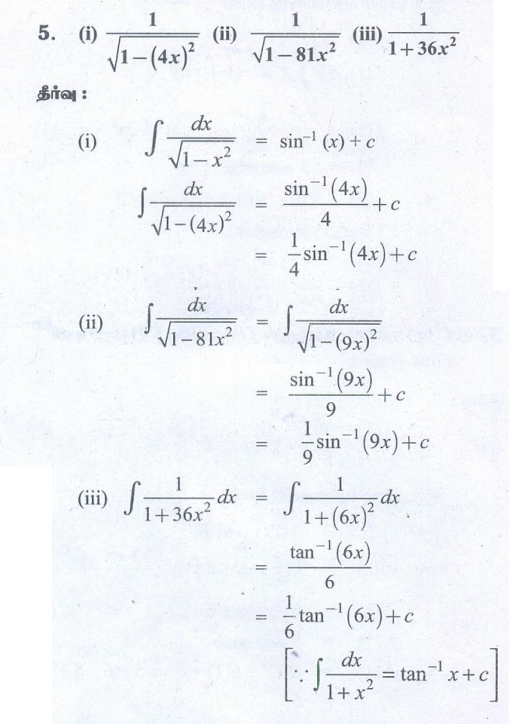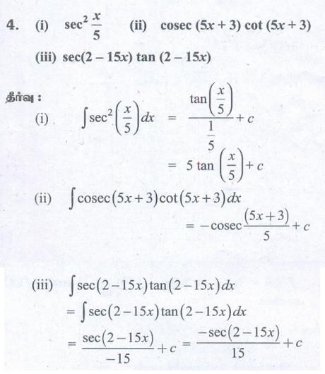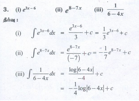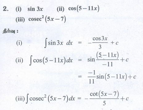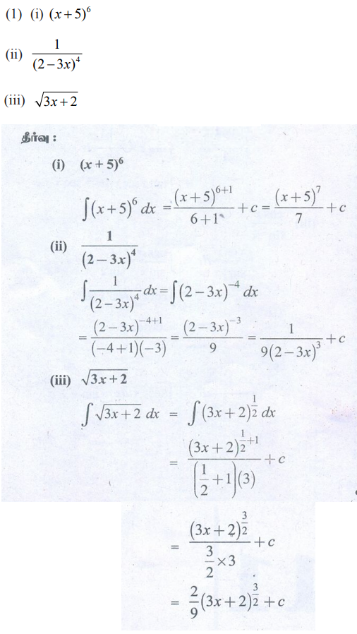 11 வது கணக்கு : அலகு 11 : தொகை நுண்கணிதம் Integral Calculus : பயிற்சி 11.2: ∫ƒ(a x+b) dx (நேரிய வடிவிலுள்ள தொகைச்சார்பு) வடிவம் - புத்தக கணக்குகளுக்கான பதில்கள், தீர்வுகள் | கணக்கு : 11 ஆம் வகுப்பு