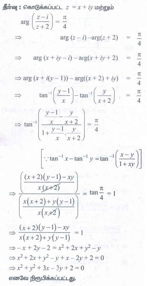 6. z = x + iy மற்றும் arg [(z − i)/(z + 2)] = π/4 எனில், x2 + y2 + 3x − 3y + 2 = 0 எனக்காட்டுக.