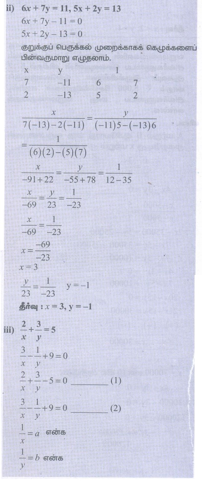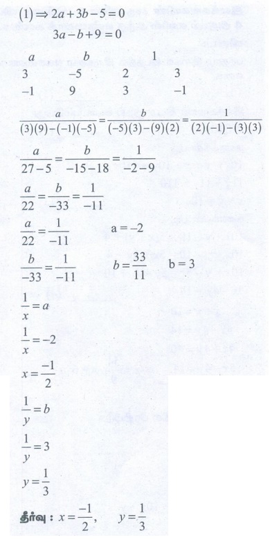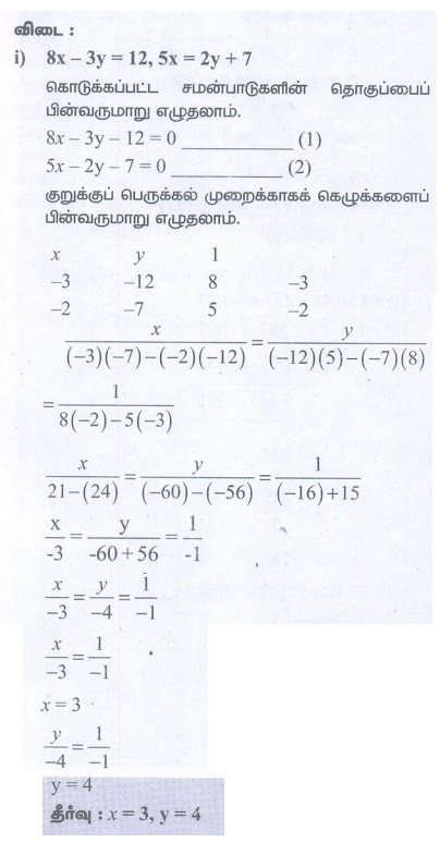 9 ஆம் வகுப்பு கணக்கு : அலகு 3 : இயற்கணிதம் : குறுக்குப் பெருக்கல் முறையில் தீர்வு காணுதல் (Solving by Cross Multiplication Method) - இரு மாறிகளில் அமைந்த நேரியச் சமன்பாடு (Linear Equation in Two Variables), எண்ணியல் கணக்குகள் பதில்கள் மற்றும் தீர்வுகள் | இயற்கணிதம் | கணக்கு : 9 ஆம் வகுப்பு