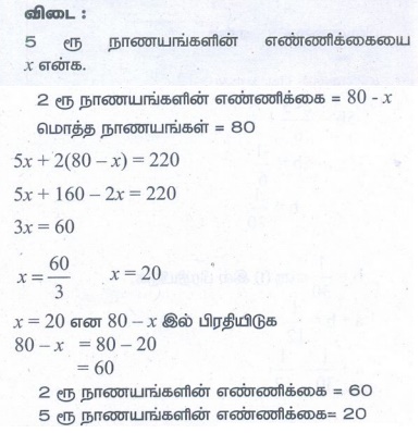 2. அட்சயா தனது பணப்பையில் (purse) இரண்டு ரூபாய் நாணயங்களையும், ஐந்து ரூபாய் நாணயங்களையும் வைத்திருந்தாள். அவள் மொத்தமாக ₹ 220 மதிப்புடைய 80 நாணயங்களை வைத்திருந்தாள் எனில், ஒவ்வொன்றிலும் எத்தனை நாணயங்கள் வைத்திருந்தாள்.
