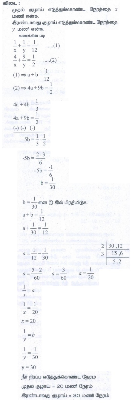 3. இரு வெவ்வேறு அளவு விட்டமுடைய குழாய்கள் மூலம் ஒரு நீச்சல் குளத்தில் முழுமையாக நீர் நிரப்ப 24 மணி நேரம் ஆகும். அதிக விட்டமுடைய குழாயை 8 மணி நேரமும் குறைந்த விட்டமுடைய குழாயை 18 மணி நேரமும் பயன்படுத்தி நீர் நிரப்பினால் நீச்சல் குளத்தில் பாதி அளவு நீர் நிரம்பும் எனில், தனித்தனியாக அந்தக் குழாய்களைக் கொண்டு நீச்சல் குளம் முழுவதிலும் நீர் நிரப்ப ஆகும் கால அளவுகளைக் காண்க.