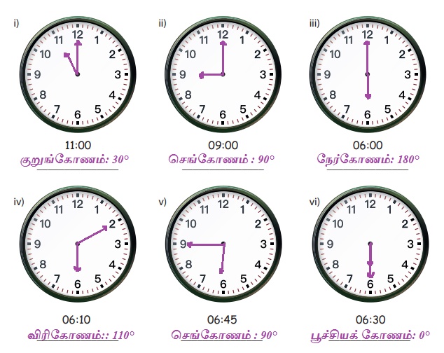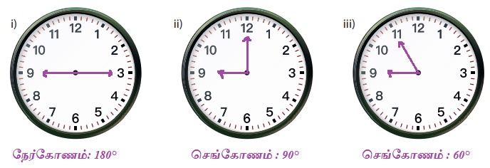 1. கோணங்கள் i) 180°, ii) 90°, iii) 60° ஆக இருக்கும்போது கடிகாரத்தில் நேரத்தை காண்பிக்கவும்.