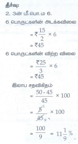5. 2 பொருள்கள் ₹15 வீதம் என சில பொருள்கள் வாங்கப்பட்டு அவை 3 பொருள்கள் ₹25 வீதம் என விற்கப்பட்டால் இலாபம் சதவீதத்தைக் காண்க.