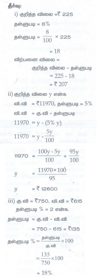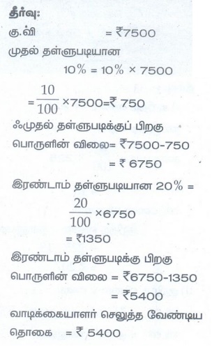 10. ஒரு மெத்தையின் குறித்த விலை ₹7500. இதற்கு இரண்டு தொடர் தள்ளுபடிகள் முறையே 10% மற்றும் 20% என வழங்கப்பட்டால், வாடிக்கையாளர் செலுத்த வேண்டியத் தொகையைக் காண்க.