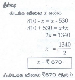 3. ஒரு பொருளை ₹810 இக்கு விற்றதால் கிடைத்த இலாபமும் அதே பொருளை ₹530 இக்கு விற்றதால் ஏற்பட்ட நட்டமும் சமம் எனில், அந்தப் பொருளின் அடக்க விலையைக் காண்க.