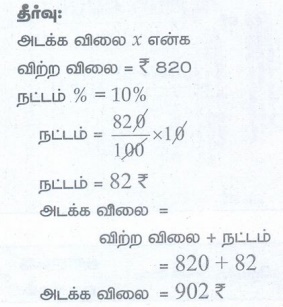 2. ஒரு பொருளை ₹820 இக்கு விற்பதனால், விற்கும் விலையில் 10% அளவு நட்டம் ஏற்படுகிறது எனில், அந்தப் பொருளின் அடக்க விலையைக் காண்க.