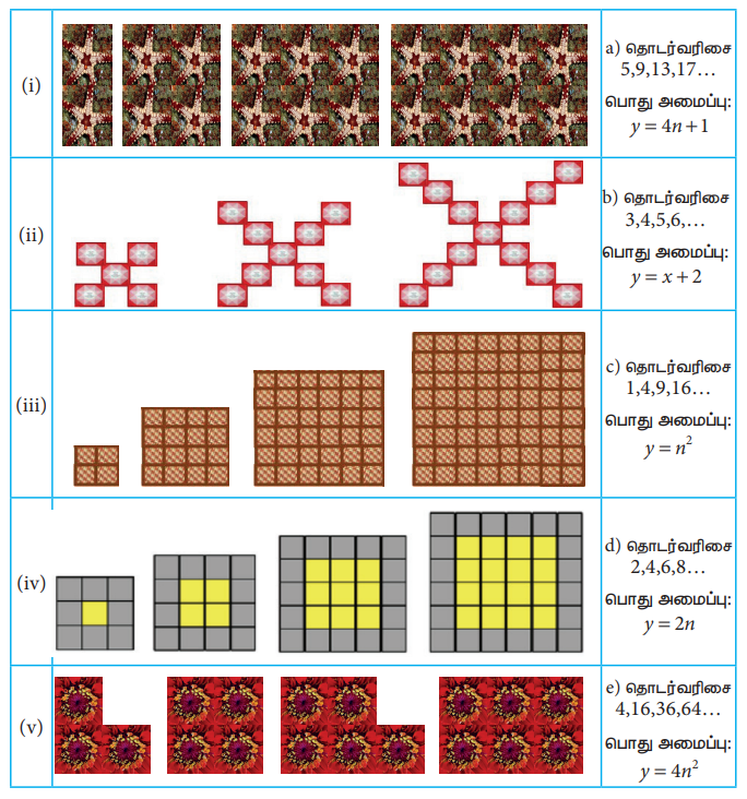 iv) (c) தொடர்வரிசை : 1, 4, 9, 16... பொது அமைப்பு : y = n2
