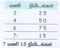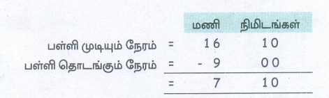 ஆ) ஒரு பள்ளி காலை 9 மணி முதல் மாலை 4:10 மணி வரை நடைபெறுகிறது. எனில், பள்ளி வேலை செய்யும் நேரம் எவ்வளவு?
