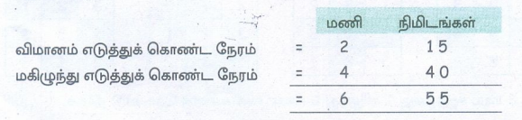 உ) ஒரு நபர் அஹமதாபாத்திலிருந்து தமிழ்நாட்டிலிருக்கும் தன் சொந்த கிராமத்திற்கு வருகிறார். அவர் விமானம் மூலம் 2 மணி 15 நிமிடங்கள் மற்றும் 4 மணி 40 நிமிடங்கள் மகிழுந்திலும் பயணித்தார். அவர் பயணித்த மொத்த நேரம் எவ்வளவு?