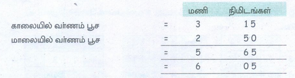ஊ) ஒரு வண்ணம் பூசுபவர் ஒரு வீட்டை 3 மணி 15 நிமிடங்கள் காலையிலும் 2 மணி 50 நிமிடங்கள் மாலையிலும் வண்ணம் பூசினார். எனில், அவர் வண்ணம் பூசிய மொத்த நேரம் எவ்வளவு?