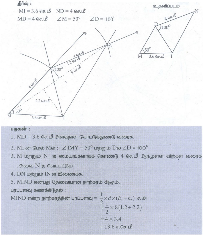 4. நாற்கரம் MIND, MI = 3.6 செ.மீ, ND = 4 செ.மீ, MD= 4 செ.மீ, ∠M = 50° மற்றும் ∠D = 100°.