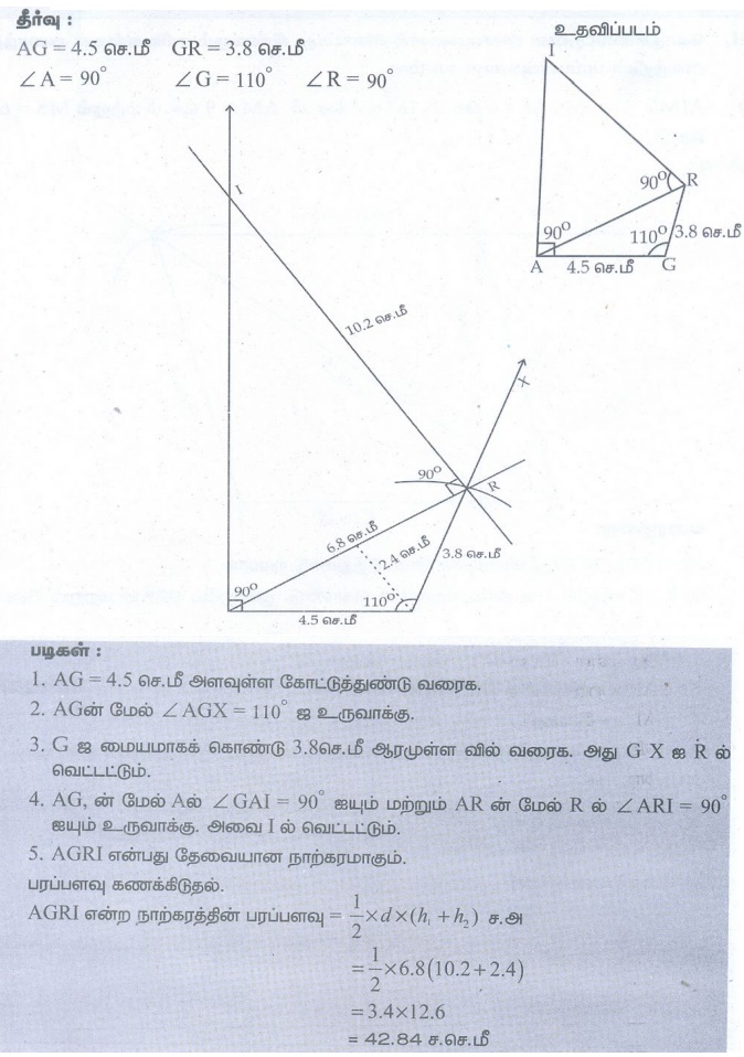 5. நாற்கரம் AGRI, AG = 4.5 செ.மீ, GR = 3.8 செ.மீ , ∠A = 60°, ∠G = 110° மற்றும் ∠R = 90°.