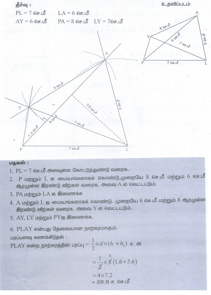 2. நாற்கரம் PLAY, PL = 7 செ.மீ, LA = 6 செ.மீ, AY = 6 செ.மீ, PA = 8 செ.மீ மற்றும் LY = 7 செ.மீ