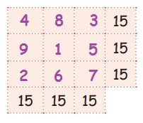 2. 3 × 3 மாய சதுரத்தை கிடைமட்டமாகவும் செங்குத்தாகவும் கூட்டும் போது கூடுதல் 15 வருமாறு 1லிருந்து 9வரை எண்களைக் கொண்டு தீர்க்க.