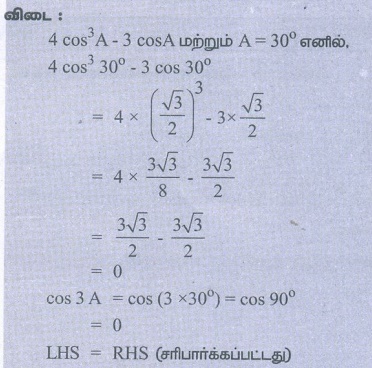 3. A = 30° எனில், cos 3A = 4 cos3A – 3 cos A என்பதைச் சரிப்பார்க்க