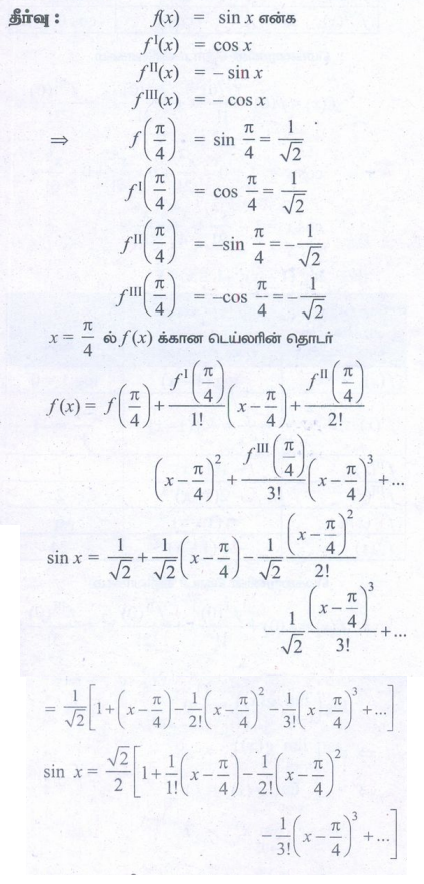 3. sin x -ன் விரிவை x – π/4 -ன் அடுக்குகளாக முதல் மூன்று பூச்சியமற்ற உறுப்புகள் வரை காண்க.