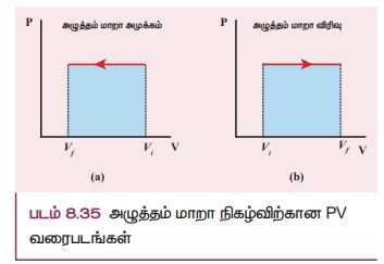 படம் 8.35 இல் காட்டியுள்ளவாறு அழுத்தம் மாறா நிகழ்விற்கான PV வரைபடம் பரும் அச்சுக்கு இணையாகச் செல்லும் ஓர் கிடைத்தளக் கோடாகும். பருமன் குறையும் அழுத்தம் மாறா நிகழ்வினை படம் 8.35 (a) காட்டுகிறது.