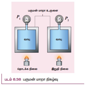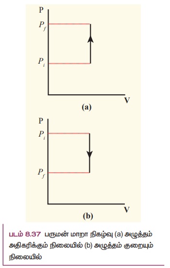 இதிலிருந்து நாம் அறிவது என்னவென்றால் அமைப்பிற்குக் கொடுக்கப்படும் வெப்பம் அக ஆற்றலை மட்டுமே அதிகரிக்கும். இதன் விளைவாக வெப்பநிலை உயரும் மேலும் அழுத்தமும் அதிகரிக்கும். இது படம் 8.38 இல் காட்டப்பட்டுள்ளது.