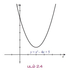 (iii) எடுத்துக்காட்டாக, y = x2 - 4x + 5 (படம் 2.4) என்ற வரைபடத்தைப் பார்க்கலாம். இந்த வரைபடம் x- அச்சை வெட்டாததால், x2 - 4x + 5 = 0 -க்கு மெய்யெண்கள் தீர்வாக அமையாது.