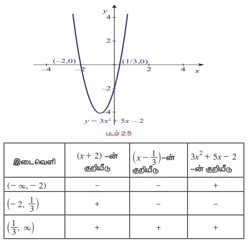 இருபடிக் கோவையைக் காரணிப்படுத்த, 3(x + 2)(x- 1/3 ) ≤ 0 எனக் கிடைக்கும். ஒரு எண்கோட்டில் மாறுநிலைப் புள்ளிகளான -2 மற்றும் -1/3 (படம் 2.5) ஆகியவற்றைக் குறிக்கவும். ஒவ்வொரு இடைவெளியிலும் (x + 2)(x – 1/3)-ன் மிகைத் தன்மையைச் சோதிக்கவும். அவ்விடைவெளியில் ஏதேனும் ஒரு புள்ளியை எடுத்துக்கொள்க. கிடைக்கும் விடையின் குறியீடு என்னவோ, அதுவே இவ்விடைவெளியில் உள்ள அனைத்துப் புள்ளிகளையும் பிரதியிடக் கிடைக்கும் விடைகளின் குறியீடாகும். (இல்லையெனில், இந்த இடைவெளியில் மற்றொரு மாறுநிலைப்புள்ளி இருப்பதாகும்) இதைக் கீழ்க்கண்ட அட்டவணையின் மூலம் எளிதில் புரிந்துகொள்ளலாம்.