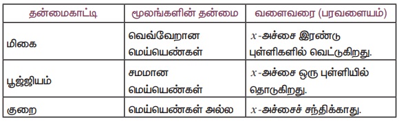 (iv) இரு படி சமன்பாட்டின் மூலங்களின் தன்மையை D = b2 – 4ac என்ற தன்மைகாட்டி மூலம் விவரிக்கும் அட்டவணை கீழே கொடுக்கப்பட்டுள்ளது.