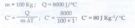 100 கி.கி எடையுள்ள பாத்திரத்தின் வெப்ப ஏற்புத்திறன் 8000 J / K. அதன் தன் வெப்ப ஏற்புத்திறனைக்