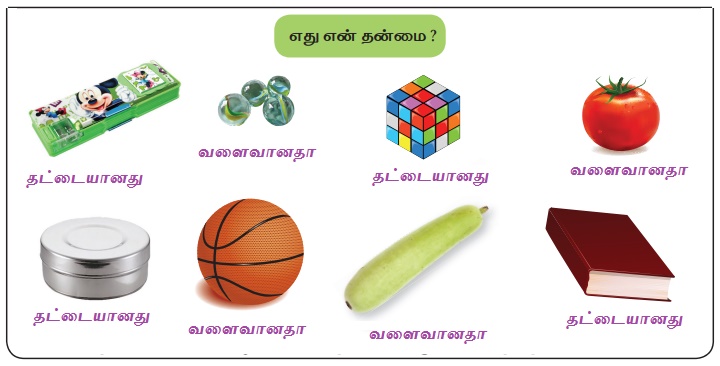 மாண வர் ஒருவரை அழைத்து, அவரின் கண்களின் மீது துணியைக் கட்டவும். மேற்கண்ட பொருள்களில் ஏதேனும் ஒன்றை, அந்த மாண வரிடம் கொடுத்து, அதனைத் தொட்டு உணர்ந்து அது “தட்டையானதா? அல்லது வளைவானதா? எனக் கூறச் செய்யவும். இதே செயல்பாட்டை மற்ற பொருட்களைக் கொண்டு செய்வதற்கு வெவ்வேறு மாண வருக்கு வாய்ப்பளிக்கவும்.