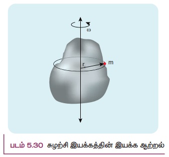 திண்மப் பொருள் ஒன்று அச்சைப் பொருத்துக் கோணத் திசைவேகம் ω வுடன் சுழல்வதைப் படம் 5.30 இல் காணலாம். பொருளில் உள்ள ஒவ்வொரு துகளும் அச்சைப் பொறுத்து ஒரே கோண திசைவேகத்தையும் (ω) ஆனால் வெவ்வேறான தொடுகோட்டுத் திசைவேகங்களையும், பெற்றிருக்கும்.