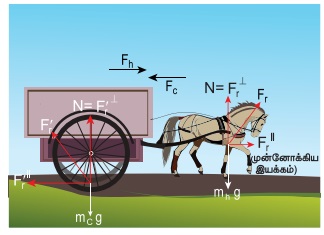 (iii) வண்டி, குதிரையின் மீது செலுத்தும் பின்னோக்கிய விசை (Fc)