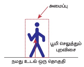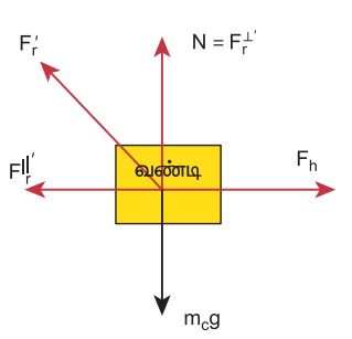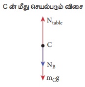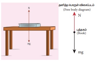 ii. மேசையின் பரப்புமீது, செங்குத்து விசை (N) க்கு எதிராக புத்தகம் செலுத்தும் விசை. இவ்விசை கீழ்நோக்கி செயல்படும்.