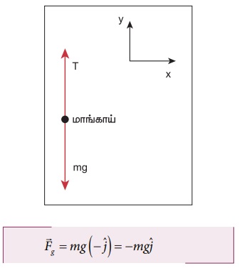 i. மாங்காயின் மீது எதிர்க்குறி y அச்சுத்திசையில் கீழ் நோக்கி செயல்படும் புவியீர்ப்பு விசை, நேர்க்குறி y அச்சுத்திசையில் செயல்படும் மாங்காயைத் தாங்கியுள்ள காம்பு, மாங்காயின் மீது செலுத்தும் மேல் நோக்கிய இழுவிசை. மாங்காயின் விசைப்படம் கீழே காட்டப்பட்டுள்ளது.
