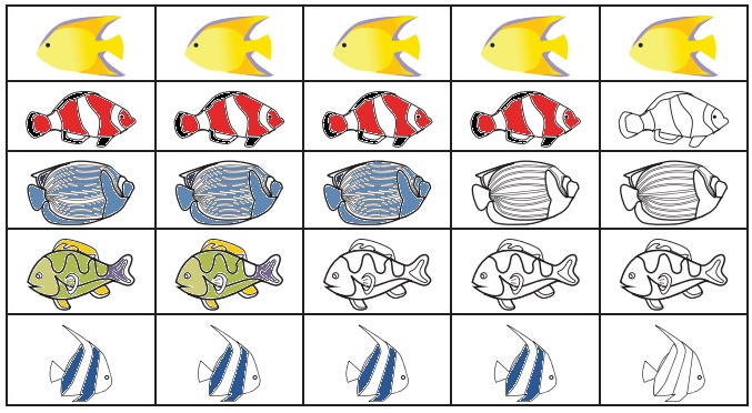 பின்வரும் மீன்களுக்கு மீன் தொட்டியில் உள்ள மீன்களின் எண்ணிக்கைக்கு ஏற்ப வண்ணம் தீட்டுக.
