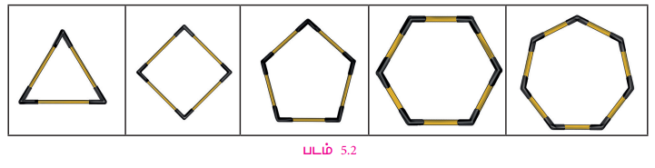 கீழே கொடுக்கப்பட்டுள்ள படத்தில் தீக்குச்சிகளைப் பயன்படுத்தி பக்கங்களின் எண்ணிக்கையை அதிகரிப்பதன் மூலம் பலகோண அமைப்புகள் உருவாகின்றன.