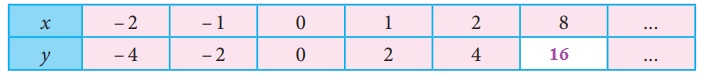 x மற்றும் y க்கு இடையேயான தொடர்ப்பு , y = 2x.