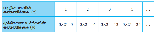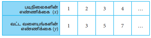 2. கொடுக்கப்பட்டுள்ள படத்தில் x என்பது படி நிலைகளின் எண்ணிக்கையையும், y என்பது வடிவங்களை அமைக்கப் பயன்படுத்தப்பட்ட தீக்குச்சிகளையும் குறிக்கிறது எனில், x மற்றும் y இன் மதிப்புகளுக்கிடையே உள்ள தொடர்பை அட்டவணைப்படுத்துதலின் மூலம் காண்க.