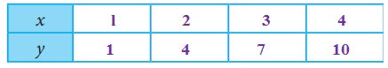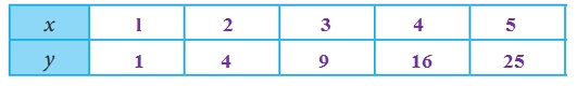 அட்டவணையினை உற்றுநோக்குக. x மற்றும் y இக்கு இடையேயான தொடர்பைப் பின்வருமாறு பட்டியலிடுக :