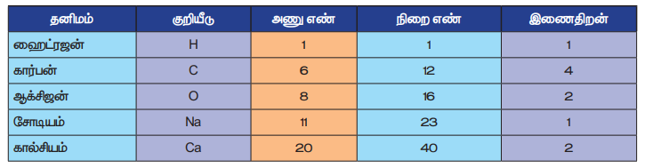 அட்டவணை 4.4 தனிமங்களின் குறியீடு, அணு எண், நிறை எண் மற்றும் இணைதிறன்