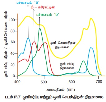 • குளோரோஃபில் 'a' மற்றும் குளோரோஃபில் 'b' நிறமியானது நீலம் மற்றும் சிவப்பு