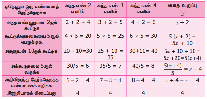 நாம் தேர்ந்தெடுக்கும் எண் எதுவாக இருந்தாலும், இறுதியாகக் கிடைக்கும் எண் 4 ஆகும். இதனை உன் நண்பர்களுடன் விளையாடி, அவர்களை ஆச்சரியப்படுத்தலாம். இயற்கணிதக் கோவைகளின் அடிப்படையில் இதன் வழிமுறை அட்டவணையின் இறுதி நிரலில் பொதுமைப்படுத்தப்பட்டுள்ளது. அதனை உற்றுநோக்குவதன் மூலம், புதிய எண் அமைப்புகளை உருவாக்கி விளையாட முயலலாம்