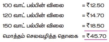 இருசன் மின்னணுக் கடைக்குச் சென்று, 100 வாட், 120 வாட், 150 வாட் பல்புகளை = ₹ 12.50, ₹ 14. 70, ₹ 18.50 இக்கு வாங்கினார். அவர் செலவழித்த தொகை எவ்வளவு?