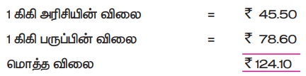 சங்கர் ஒரு கிலோ அரிசி, ஒரு கிலோ பருப்பை ₹ 45.50, ₹ 78.60 இக்கு வாங்கினார். மொத்த விலையைக் காண்க.