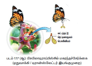 இதன் மலர் ஆண் முன் முதிர்வுதன்மை கொண்டது. ஈருதடு வடிவமுடைய அல்லி வட்டத்தையும், இரு மகரந்தத்தாள்களையும் கொண்டது. சால்வியாவில் மகரந்தச்சேர்க்கை நடைபெற நெம்புகோல் இயங்குமுறை உதவுகிறது. ஒவ்வொரு மகரந்தப்பையும் மேற்புறத்தில் வளமான மகரந்த மடலையும் கீழ்ப்புறத்தில் வளமற்ற மகரந்த மடலையும் கொண்டுள்ளது. மகரந்த மடல்களுக்கு இடையே காணப்படும் நீண்ட இணைப்புத்திசு மகரந்தப்பை இங்குமங்கும் நன்கு அசைந்தாட உதவுகிறது. தேனீ நுழையும் போது மலரின் கீழ்ப்புற உதடு தேனீ அமர்வதற்குரிய தளமாகிறது. தேனீ பூத்தேன் உறிஞ்ச தலையை உள்ளே நுழைக்கும் பொழுது தேனீயின் உடல் இணைப்புத்திசுவில் படுகிறது. இதனால் மகரந்தப்பையின் வளமான பகுதி கீழிறங்கி (தாழ்ந்து) தேனீயின் முதுகில் மோதுகிறது. எனவே தேனீயின் உடலில் மகரந்தத்துகள் படிகின்றன. தேனீ மற்றொரு மலரினுள் நுழையும் பொழுது மகரந்தத்துகள் அம்மலரின் சூலகமுடியில் விழுவதன் மூலம் சால்வியாவில் மகரந்தச்சேர்க்கை நிறைவடைகிறது (படம் 1.17 அ). இதுதவிர பொறி இயங்குமுறை (அரிஸ்டலோக்கியா), விழுகுழி இயங்குமுறை (ஆரம்), கவ்வி அல்லது ஏதுவாக்கி இயங்குமுறை (அஸ்கிளபியடேசி), உந்துதண்டு இயங்குமுறை (பாப்பிலியோனேசி) என சில சுவாரசியமான மகரந்தச்சேர்க்கை முறைகள் பல்வேறு தாவரங்களில் காணப்படுகின்றன.