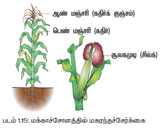 மக்காச்சோளத்தில் மகரந்தச்சேர்க்கை (Zea mays): இத்தாவரம் ஆண் - பெண் (monoecious) மலர்களுடைய ஒருபால் (unisexual) மலர்கள் கொண்டது. ஆண் மஞ்சரி (கதிர்குஞ்சம் - tassel) தாவரத்தின் நுனிப் பகுதியிலும், பெண் மஞ்சரி (கதிர் - cob) கீழ்மட்டத்தில் பக்கவாட்டிலும் காணப்படும். மக்காச்சோளத்தில் மகரந்தத்துகள் பெரியவை, அதிக எடையுள்ளவை, மெல்லிய காற்றினால் எடுத்துச்செல்ல முடியாதவை. எனினும் காற்றால் ஆண் மஞ்சரி அசைக்கப்படும்போது மலரிலுள்ள மகரந்தத்துகள் கீழ்நோக்கி விழுகின்றன. பெண் மஞ்சரியின் மலர்களில் சுமார் 23 செ.மீ. நீளமுள்ள சூலகமுடி (silk) காணப்படுகிறது. மேலும் இது இலைகளை தாண்டி அவற்றிற்கு மேல் நீண்டுள்ளது. கதிர்குஞ்சத்தில் இருந்து விழும் மகரந்தத்துகள்களை சூலக முடிகள் பற்றிக் கொள்கின்றன (