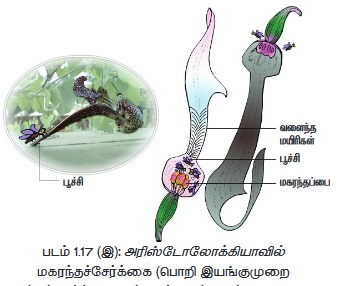 அரிஸ்டலோக்கியாவில் பொறி இயங்குமுறை என்ற சிறப்பு முறையில் மகரந்தச்சேர்க்கை நடைபெறுகிறது. இலைக்கோணத்திலமைந்த குழல் போன்ற பூவிதழ்களைக் கொண்ட மலர்கள் காணப்படுகின்றன. இதன் அடிப்பகுதி கைனோஸ்டீஜியம் கொண்டு பருத்து காணப்படுகிறது. கைனோஸ்டீஜியத்தில் ஆறு மகரந்தத் தாள்கள் காணப்படுகின்றன. குழல் போன்ற பூவிதழின் உட்புறச்சுவர் வழுக்கும் தன்மையுடனும் கீழ்ப்புறம் நோக்கி நீட்டியுள்ள விறைப்பான மயிரிகளைக் கொண்டும் காணப்படுகிறது.