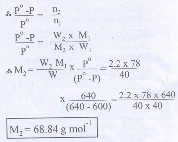 47. குறிப்பிட்ட வெப்பநிலையில், தூய பென்சீனின் (C6H6) ஆவி அழுத்தம் 640 mm Hg. 40 கிராம் பென்சீனுடன் 2.2 g ஆவியாகாத கரைபொருள் சேர்க்கப்படுகிறது. இதனால் உருவான கரைசலின் ஆவியழுத்தம் 600 mm Hg எனில், கரைபொருளின் மோலார் நிறையை கணக்கிடுக.
