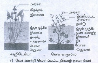 v. நீர் நில வாழ்பவை அல்லது வேர் ஊன்றி வெளிப்பட்ட நீர் வாழ் தாவரங்கள் (Amphibious hydrophytes (Rooted emerged hydorphytes):