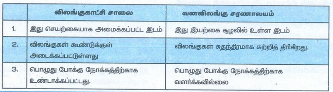 14. விலங்கு காட்சிச் சாலைக்கும் வனவிலங்கு சரணாலயத்திற்கும் உள்ள வேறுபாடு யாது?