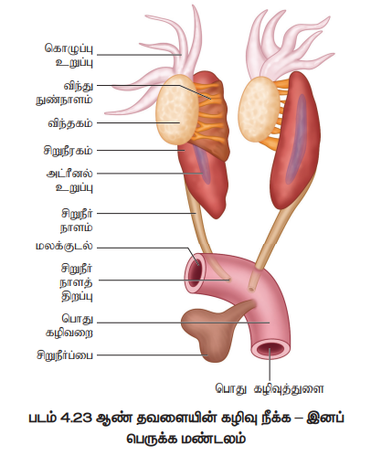 • விந்தகங்களிலிருந்து தோன்றும் விந்து நுண்குழல்கள் இறுதியில் அந்தந்தப் பக்கத்துச் சிறுநீரக நாளங்களில் திறக்கின்றன.